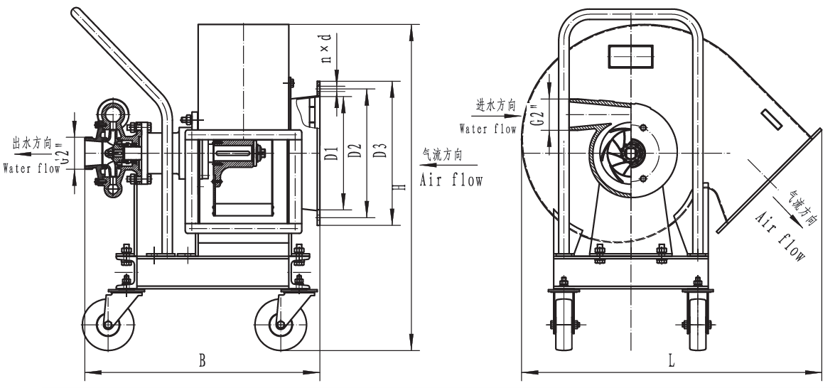 CSL型水力驱动防爆离心通风机由水轮机、机架、机壳、传动体和叶轮等组成。水涡轮用耐腐蚀铜合金精密铸造成型,机壳用奥氏体不锈钢焊成,叶轮用高强度铝合金铸成。整机